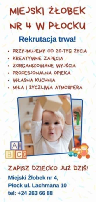 Zapraszamy do składnia kart zgłoszeniowych do Żłobka Miejskiego Nr4 w Płocku